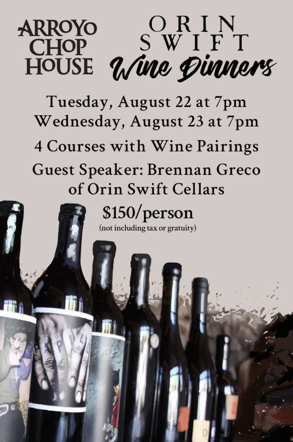Orin Swift Wine Dinners at Arroyo Chop House August 22nd and 23rd Menu coming soon. Limited space for dinners. Call today to reserve your spot! $150 per person (tax & gratuity not included) (626) 577-7463 536 South Arroyo Parkway, Pasadena, CA 91105 A Smith Brothers Restaurant arroyochophouse.com theparkwaygrill.com smittysgrill.com seconewamerican.com