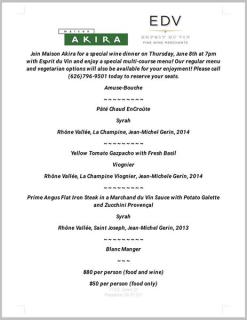 Maison Akira wine dinner June 8th Maison Akira hosts a very special Wine dinner on June 8th. Call 626-796-9501 for reservations.